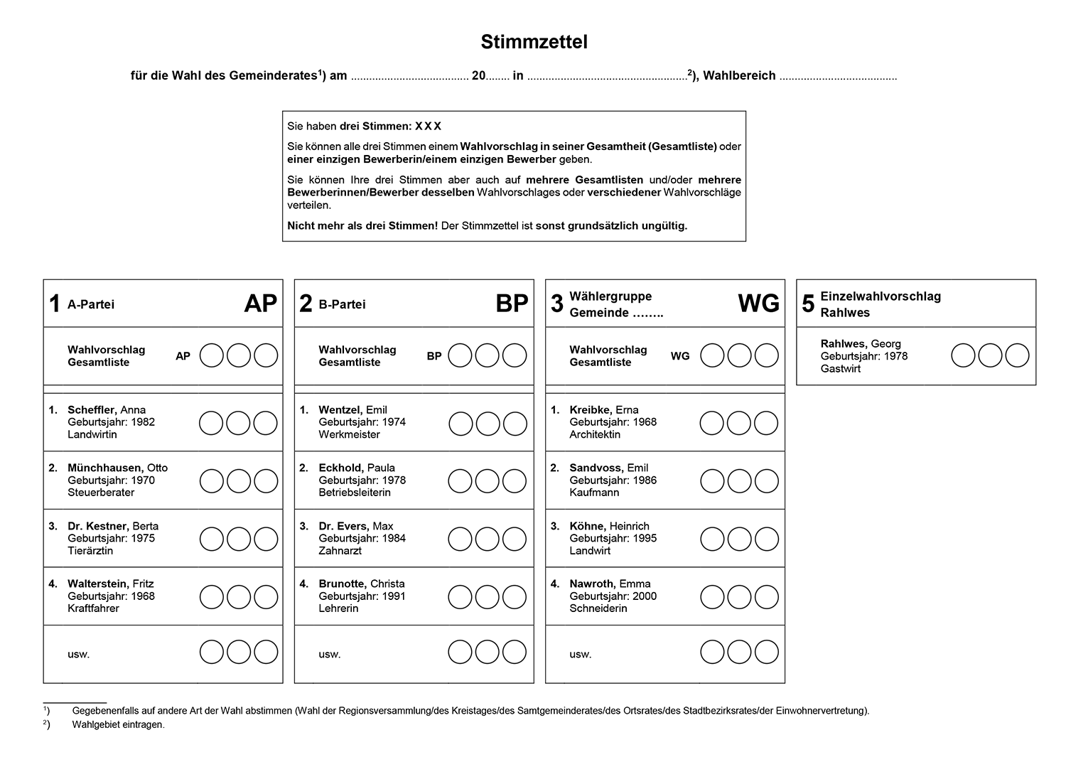 des Kreistags, einen für die Wahl des Rates deiner Gemeinde und einen für die